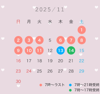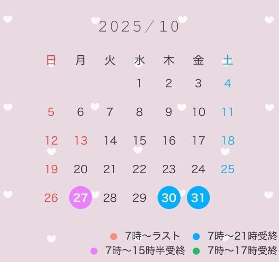お久しぶりです!ひよりです???結構お久しぶりになっちゃいましたか覚えてますか( ; ; )10月と11月前半のシフト出しました!10月の27日~また出勤します!たくさん間が空いてしまったので11月はいっぱいいます!11月後半の予定はまたもう少しお待ちください!ラストまでではない日はラスト枠は受終の時間より60分または要相談で80分までのコースで可能です!(例 21時受終の場合 ラスト枠は21時~60分or80分)姫予約なのですがTwitter凍結してしまったようなのでLINE@を作ってみたのでよければそちらからご連絡ください??LINE ID 326sjfyl?