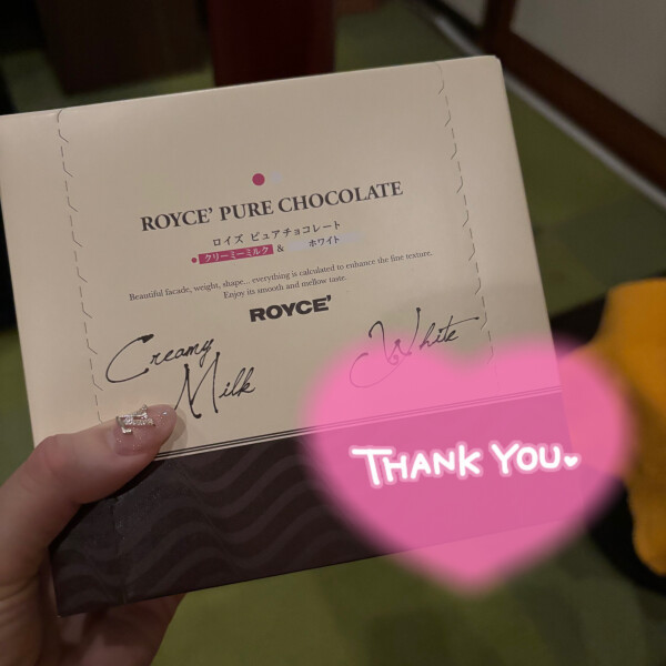sp1207分コースのお兄様?北海道からお友達さんに会いにプチ旅行でお越しのお兄様!会う前に、ネットでけいちゃんに一目惚れしてくださってご予約ありがとうお聞きした時は嬉しかったっし、けいちゃん栄町第一号やね??いっぱいよしよししてくださって、包容力抜群のお兄様のぬくもりにいっぱい癒されちゃったけいもお兄様に癒しと快??をお届けできて嬉しかったよまた千葉県遊びにきてねロイズのチョコレート大好きやから嬉しかったよ?? 大事に頂きます??お友達さんと飲み楽しんでね???けい????