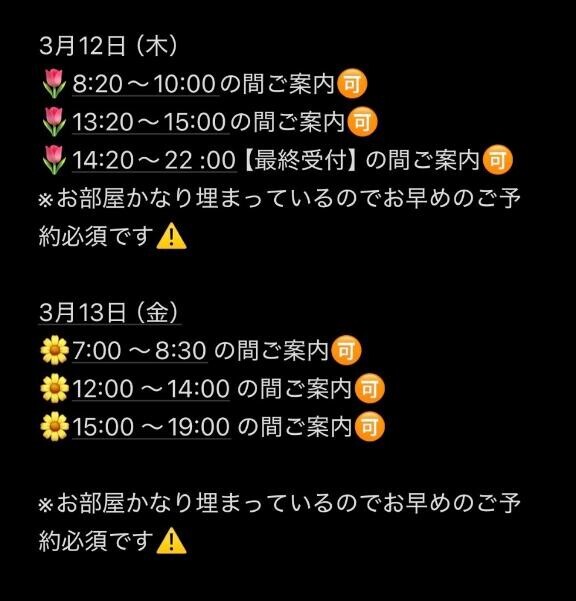 女の子の出勤人数が多く、日記も流れちゃうので定期的に???土曜日、日曜日も少しずつ枠埋まってきております。前々日、前日にはお部屋の方はほとんど埋まっておりご予約取りづらい状況ですのでお早めのご予約をよろしくお願いいたします?女の子全員日記に掲載していると思いますが、それぐらい毎日争奪戦でなかなかご予約が取れないお店ですのでご理解の程よろしくお願いいたします??けいじゃないと味わえない快??さでより深くに沼??ってみませんか?一緒にエ??さに溺れようねけい????