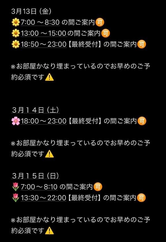 日曜日のご案内?な時間帯を掲載するのを忘れていたので、こちらが新しい表になります???本日からどんどん枠の方埋まっておりますので、お早めのご予約がより安心してご案内、お遊びできます!!?本日も7:00~お部屋ぬくぬくでお待ちしています?けい????