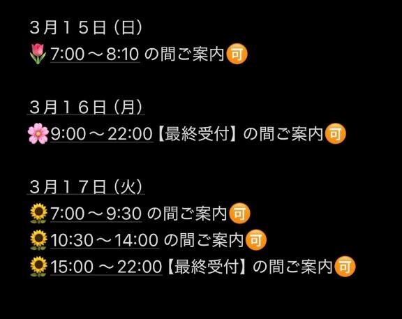 昨日はたくさんのお誘いありがとうございまきたそして、本日もたくさんのご予約本当にありがとうございます???その為、朝イチのみご案内?となっております!! 明日からは狙い目たくさんございますが、平日でもお部屋の埋まりが早いのでお早めのご予約をよろしくお願いいたします??けい?????