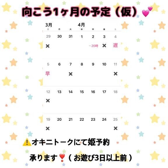 りあなです?早い時間帯お誘いくれたお兄さん達ありがとうございました???楽しく過ごせて感謝です?この後もまだまだお誘い沢山貰えると嬉しいな???お待ちしてます??????????????????????今週のシフト?24日(火)???16:00~24:0025日(水)???17:00~24:0026日(木)???17:00~24:0027日(金)???お休み28日(土)???17:00~24:0029日(日)???お休み??事前予約受付中です???オキニトークからは先行ご予約できます???①会員番号(アルファベットから始まる番号)orお名前②日付③スタート時間④コース??以上4点ご明記の上DM or オキニトークください????ご予約お待ちしてます?????????????????????スマット×スマット?りあな?