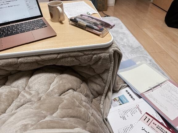 まじでやらなきゃヤバくなりー?こたつ買って座椅子買ってレポート書く時だいたいお店屋さん?資料たくさん広げるからテーブルより床派そしてお供はカフェオレ?