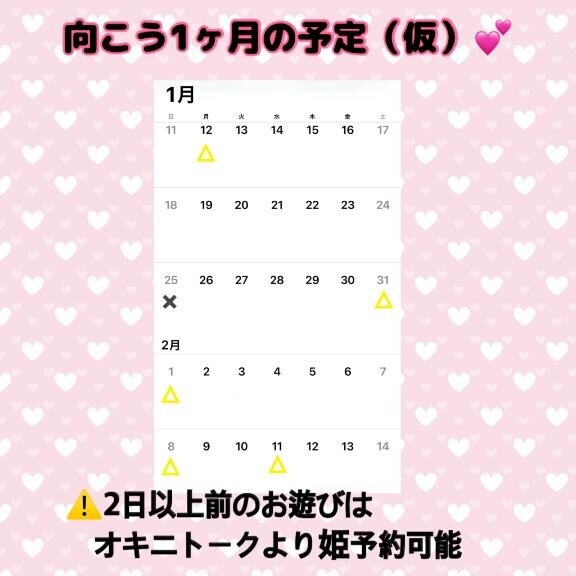 予定な未定な△ラッシュなんだけど2月前半まではこんな感じ?珍しく土日出勤たくさんできるから週末じゃなきゃこれないお兄さんには姫予約していただけたら??♀?2月入ったら日曜日はお休みor短時間出勤になる予定です?空白の日は出勤可能日だよ