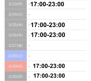 本日出勤 17:00〜23:00