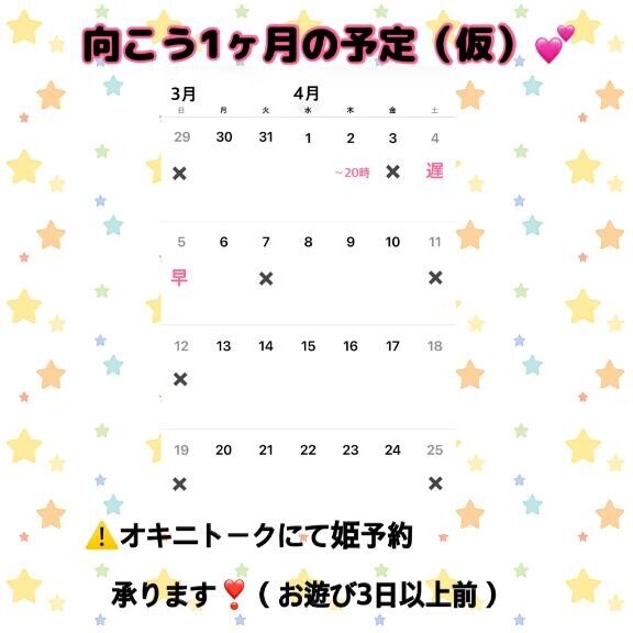 来週は、もう4月??春です??新年度、新生活にソワソワ?ドキドキ?な季節だね?来月は平日メインの出勤に戻るよ?ちなみにGWは出勤できそう??授業被らなかったー?「この日しか遊べない!」って方は、姫予約や出勤リクエストをおすすめします??♀?4月もあなたを元気にする