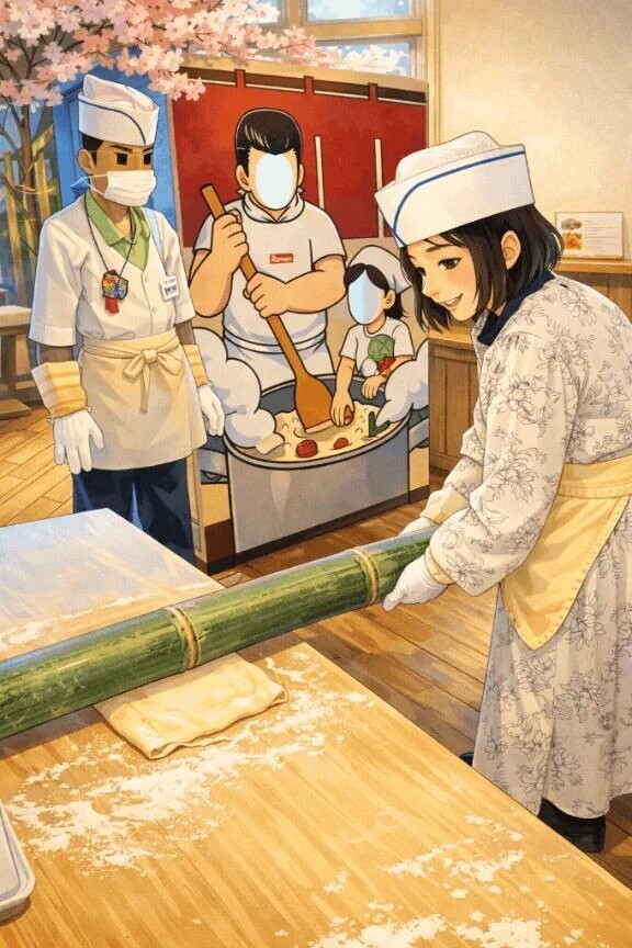 麺をつくるのに生地を棒で伸ばすんじゃなくて、青竹で生地を薄く伸ばすやり方を体験してきて、とっても楽しかった〜‼️‼️