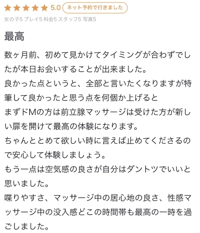 書いていただいた、個人オプションの「前立腺マッサージ」はMの方にとってもおすすめで性感帯が一つ増える+いつものフィニッシュにも磨きがかかる相乗効果があります❣️