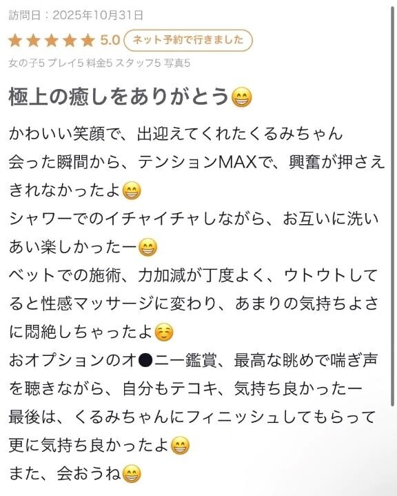 口コミありがとうございます💌💭ハロウィンのコスプレ日記を見て逢いに来てくれてうれしかったよ☺️たくさん差し入れもありがとう💓体も洗ってくれるし、くるみのタオル奪っていち早く吹いてくれてお母さんみたいな優しさ…🤱💓笑優しくしてくれてありがとうね(*ˊ˘ˋ*)マッサージもいっぱい気持ちよくなってくれて一緒にくるみも興奮したっまた会えるの待ってるね💓