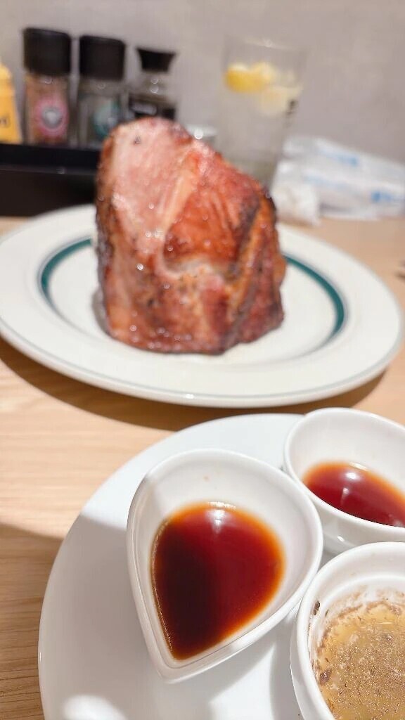 水島れいなです🐬🫧この間おっきいお肉を食べたんだよね!!写真ボケボケだけど笑友達と食べて超満腹だった✨️これ、豚肉なんだよね🐷知ってる方いるかなぁ??
