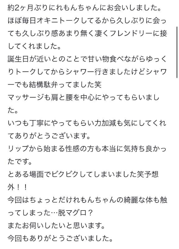 仲良しYちゃんお祝いも口コミもありがとうすぎるBIGLOVE🥹相変わらず毎日オキニトークの相手してくれて、もうなんでも話せるね!今は歯の話で大盛り上がりだけど🪥プレゼントも甘いものも嬉しくて次の仕事はそれをおやつに持って行って頑張れたよ!次会えたらマグロはマグロでも動き回るピチピチマグロになって🐟🍋