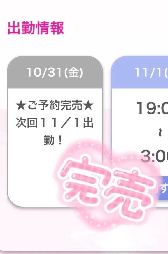 こんばんは🩷11月2日の15:00〜3:00まで出勤するよー!✨たくさんの紳士なお兄さんに会えることを楽しみしています🤍ここあ