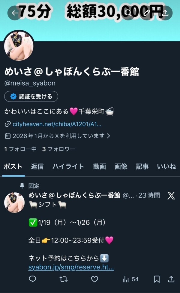 | 最安値料金 | 総額 75分 30,000円~ |