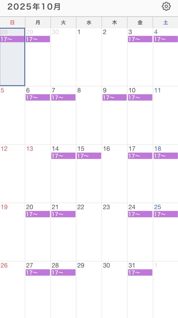 本日出勤 17:00〜翌00:00
