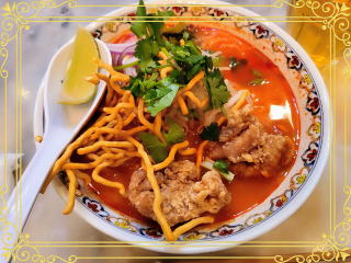 のレッスンを受けた帰りにふらりと立ち寄った某タイ料理店??にて、カオソーイ(ココナッツミルク?と唐辛子??が効いたカレースープに、サクサクに揚げた卵麺?とライム???、パクチー?を加えた、チェンマイ地方発祥??のラーメン