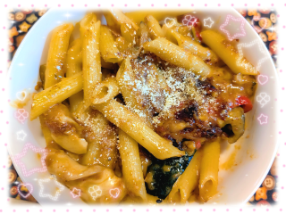 お題:得意料理教えて!に回答♪かっぱ様、ご質問ありがとうございます里芋と豚肉?のまろやか味噌チーズ炒め?と、ブロッコリー?とじゃが芋?のもちもちガレットかなぁ…今朝、茄子?とズッキーニ、パプリカ?、豆乳??、挽肉?、コチュジャン??、アラビアータソース???、ペンネで、韓国風??ピリ辛ロゼクリームグラタン??を作ってみたのですが、唐辛子??とコチュジャンのピリリとした刺激とトマト?の酸味が堪らないロゼクリームソースに、トロトロでまろやかなチーズ?が絡み、最高に美味しかったです?