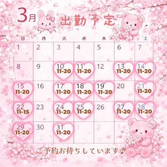 3月中旬からの出勤予定を作りました🌸会えそうな日があったらチェックしてもらえたら嬉しいです…❤️ お時間合う方、ぜひ遊びに来てくださいね☺️ご予約お待ちしています💕いろは🌸