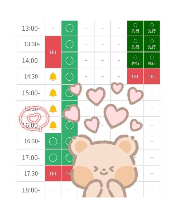 明日の日中?あります???混み混みで今日みたいに案内出来なくなっちゃうと大変なので予約がおすすめ?日曜日なのでリフレッシュや癒しがてら逢いに来て欲しいな…まってるっ?? ????!?
