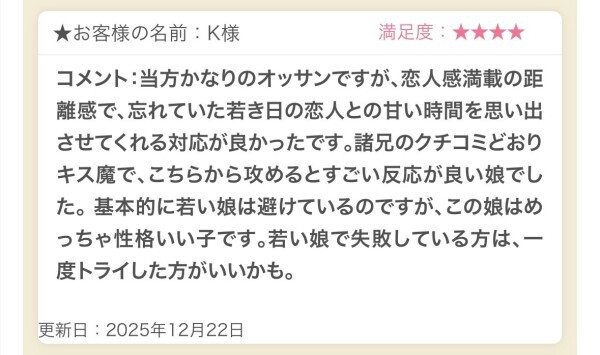 今までで最高の女性、容姿・接客と全てにおいて完璧❗️ 会った瞬間に可愛い笑顔で目の前に現れ、終始イチャイチャ🥰 話していてもとても話しやすく緊張もすぐになくなるほど ベットの上ではまた違った姿がこれは体験してみないと伝え難い ただただ最高でした❗️ 時間が経つのがあっという間でずっと一緒に居たくなる女性のるるさん次はいつ行こうかな