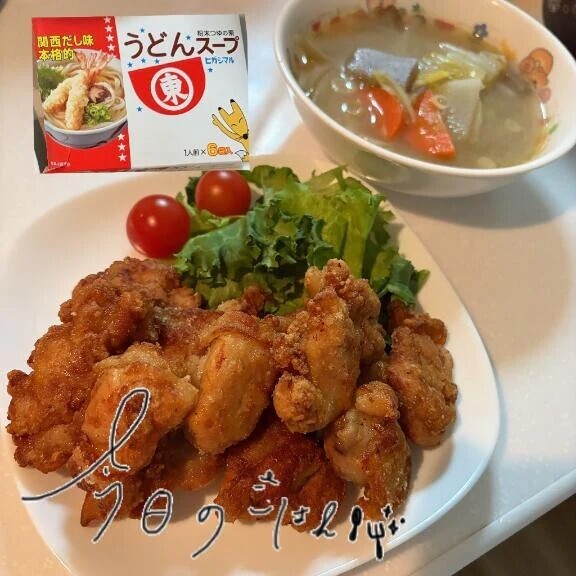 今日の夜ご飯は唐揚げ〜😋味付けは、今回はうどんの素で☺️結構おいしかったょ♪レシチャレっていうポイ活アプリで指定の材料で作って写真送るとさらにポイントGetなんだぁ🤗なので今日はそれで作りました👍あとは豚汁も食べたくて、2Lの鍋にいっぱい作ったぁ😆大量💗でも明日の夜ご飯の時には無くなりそう(笑)