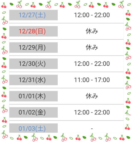 西船人妻花壇は、年内最終日12/31は、早く営業終了と新年は1/2からです。