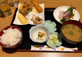 唐揚げにお刺身、エビフライに卵焼きまでついてて「え、こんなに盛りだくさんでいいの?」って毎回感動してる