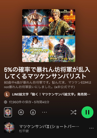 お題:最近、どんな曲聞いてる?に回答♪↓とマツケンサンバIIマツケンサンバには除霊効果があるようなのでヘンテコリンな奴を寄せ付けないために毎日聴いてます効果のほどはわからないずっとマツケンサンバ流してくれるリスト↑(たまに暴れん坊将軍)毎日ぐーを作ってシバキながらオーレェイしてます