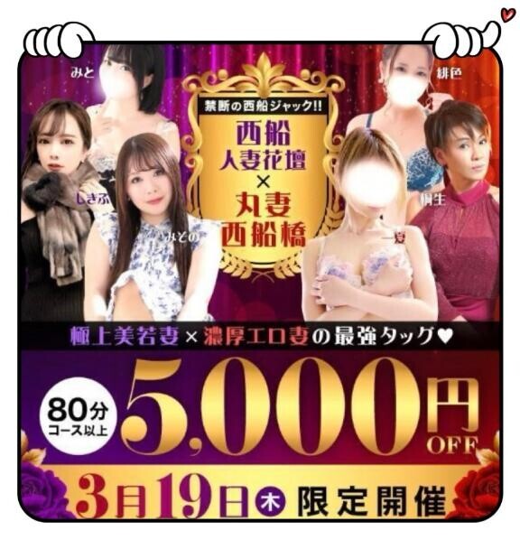 西船花壇と丸妻人妻の、コラボイベント!!開催中です★重要!!★イベントは、完全申告制なので、ご予約の受付時に、「コラボイベント使う」旨、忘れずにお伝えください。皆様、今日は、ぜひぜひ、お得に遊んでください