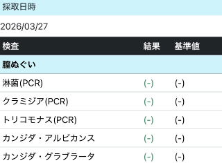 直近だと、お仕事復帰直前の【3/27(金)】に検査済みで、『膣・喉・血液』の全9項目が全て【陰性】でした
