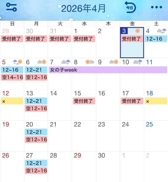 本日出勤 12:00〜19:00