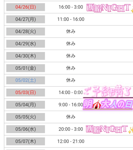 次回の出勤日は、西船NIGHT