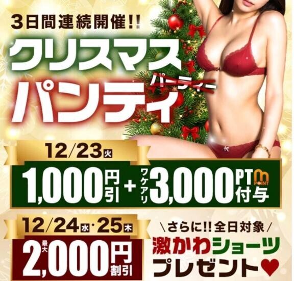 12月23日(火)~25日(木)23日と25日は80分以上1000円引き24日は80分以上2000円引き(23~25日はクリスマス激カワショーツ付き)無くなり次第終了です!お得な機会にぜひ遊んじゃいましょお問い合わせ、ご予約お待ちしております♡