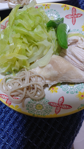 鶏むね肉とキャベツとスナップえんどうと蕎麦でした![]()