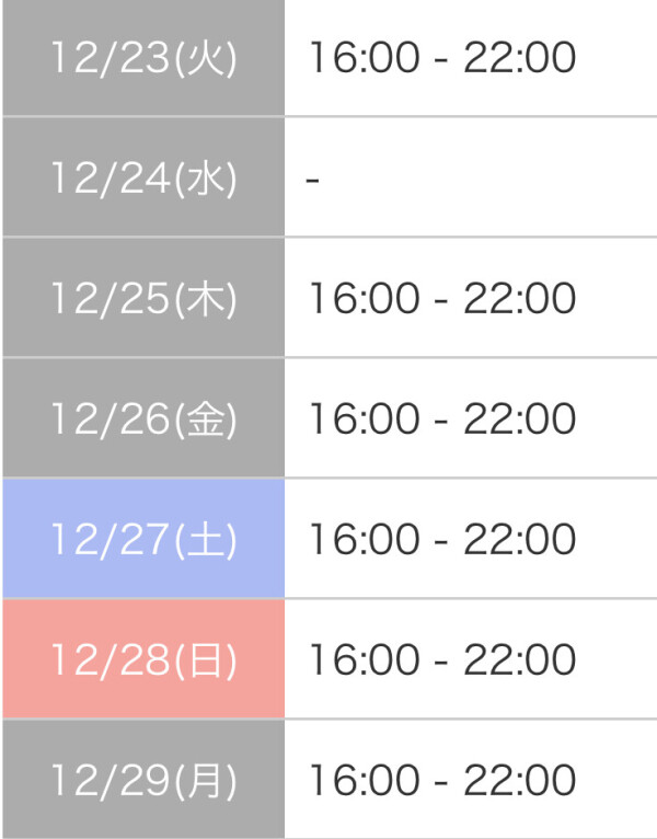本日出勤 16:00〜22:00