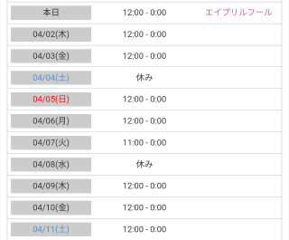 本日出勤 10:00〜翌00:00