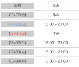 本日出勤 15:00〜21:00