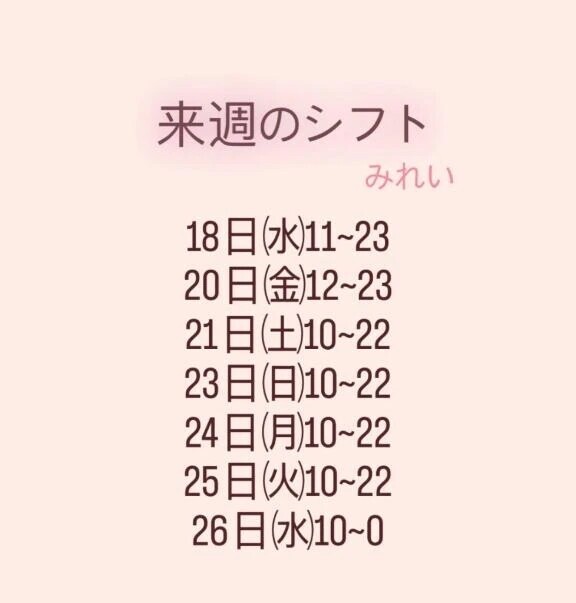 来週の出勤予定日です!日によって時間が少しづつ変わるので、確認お願いします!言っていただければ出勤時間ずらしたりするので(23時から会いたい!とか)オキニトークで連絡ください🫶