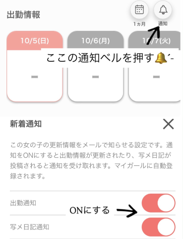 出勤通知 と 写メ日記通知 をONにすると