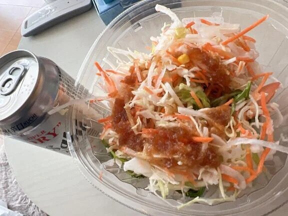 起きてから🍺🤗にパリパリ麺サラダ(これハマってます)![]()