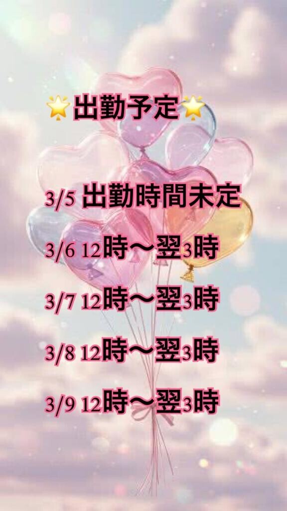 本日は18時からの出勤で明日以降の予定は画像の通りに出勤しますよ🍀*゜体力が有り余ってたらもしかしたら受付時間長くしたりするかもしれないけど🥺いつもより短い5日間だけど仲良しさんもはじめましてのお兄さんもたくさんお誘いお待ちしてます🐶