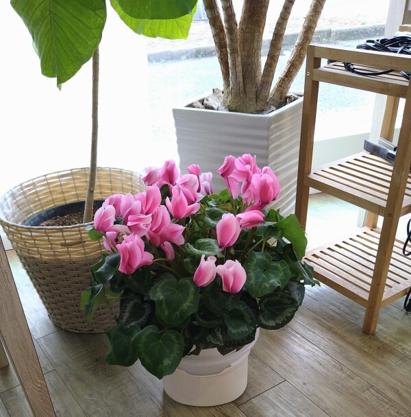 可愛らしい色のシクラメン✨を見ながら髪を切ってストレートに矯正中✂️🤗✨ トップ