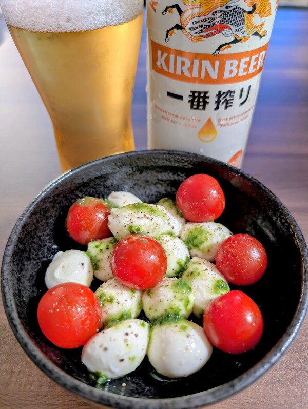 カプレーゼ風♪モッツァレラチーズ&ミニトマトに塩コショウしてオリーブオイルを少々と バジルソースをかけました☆ 投稿日時
