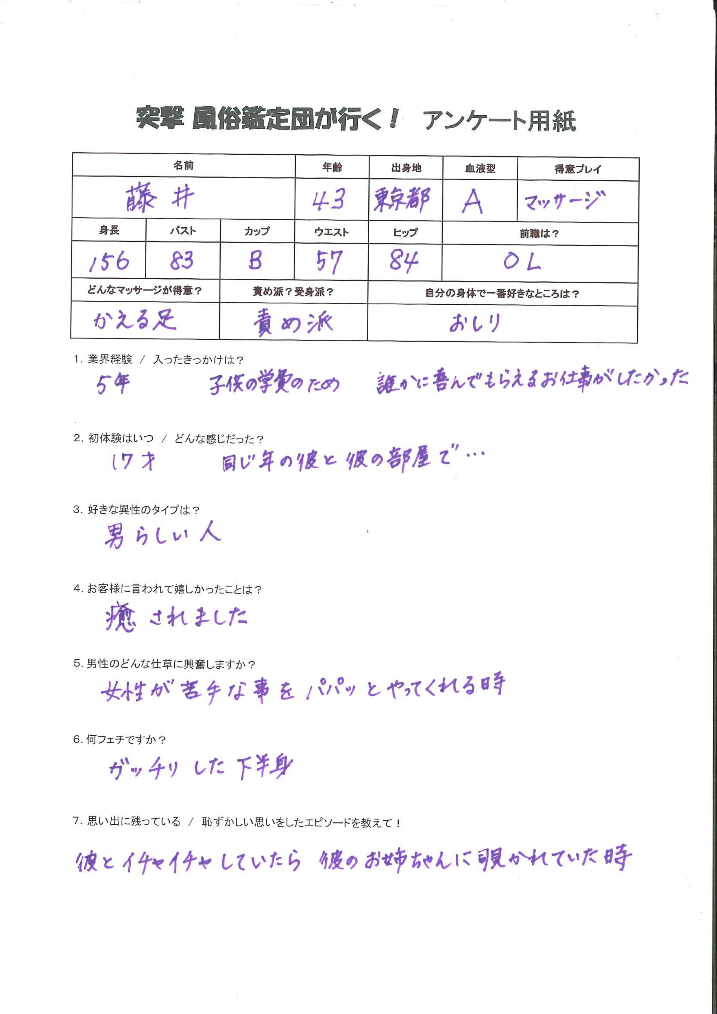 藤井(43)T156 B83(B) W57 H84