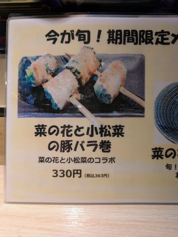 バーは明日行きます!カウンター空いてたので入っちゃいました!久しぶりに来ました!串焼き屋さん♪「菜の花と小松菜の豚バラ巻」オープンして1時間なのに 今日はもうないと言われたよぉ〜😢残念⤵️トップ