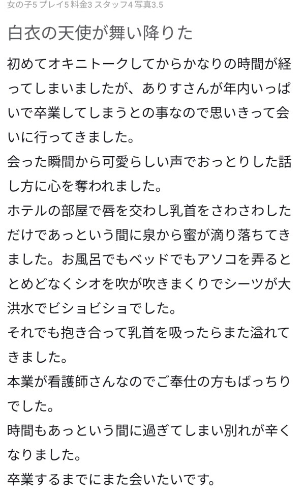 口コミありがとうございます🥰すごく嬉しいです。卒業前に会いに来てくれたの嬉しいです😊前から「みたよ」してくれて、いつも応援してくれてありがとうございます🙏また12月会えるといいな💕お家のことも大変ですけどたまには息抜きして頑張りすぎないでくださいね👋