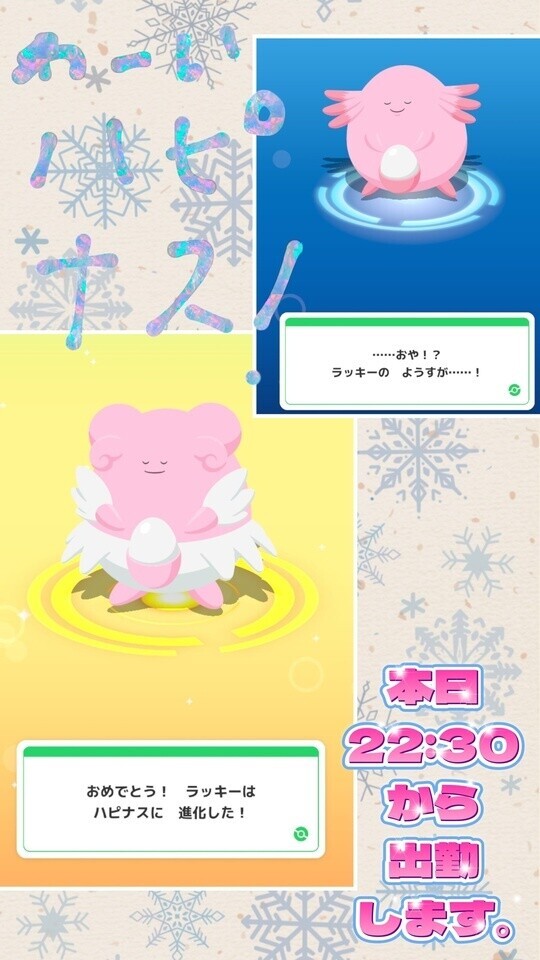 ようやく今週、ラッキーが推しのハピナスに進化しました!これでウノハナ雪原こもりが終わります。来週からどのフィールドに行こうかな?