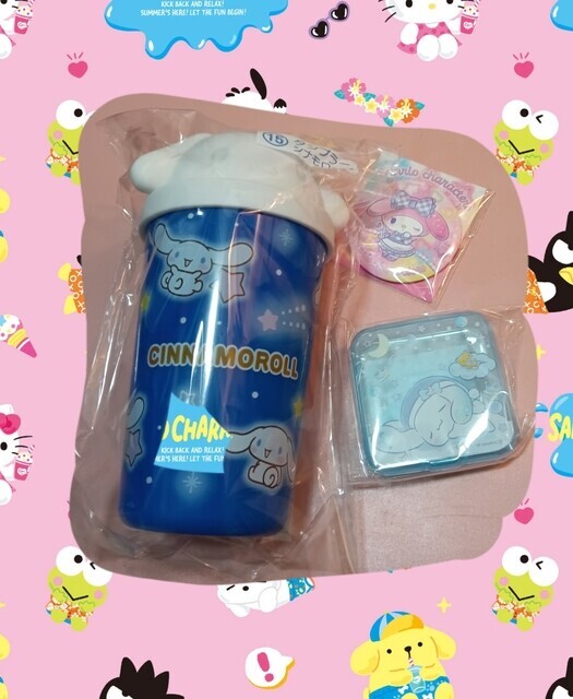 毎年キャラ大上位16キャラが当たりくじに選ばれるんですよね。今年はけろっぴ順位低めだったので、全員集合と巾着しかなく‥‥。狙いはシナモンのタンブラーでした!