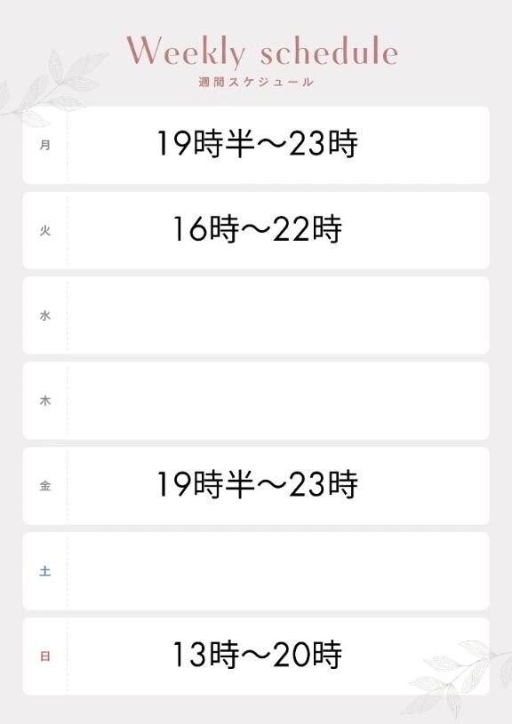 今週の予定だよー✨✨今日は、いい事あったので是非遊びきてね😊🩷🩷りん🩷🩷今日は濃厚にラブラブさ✨