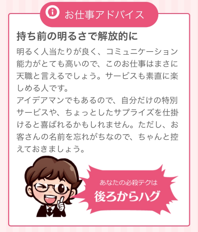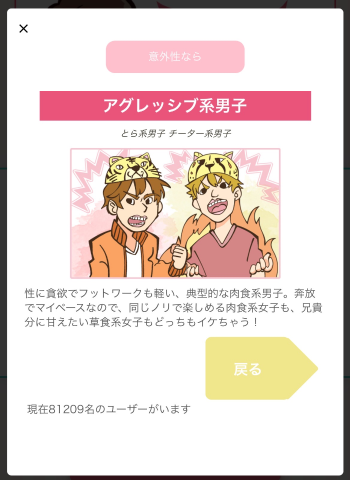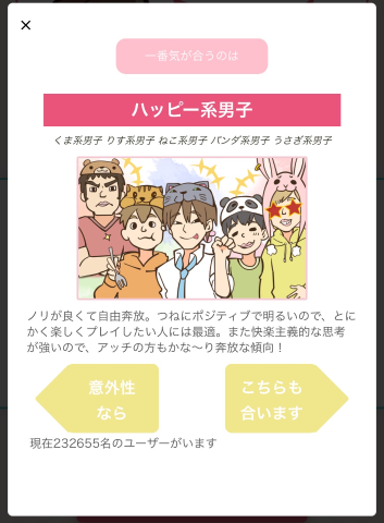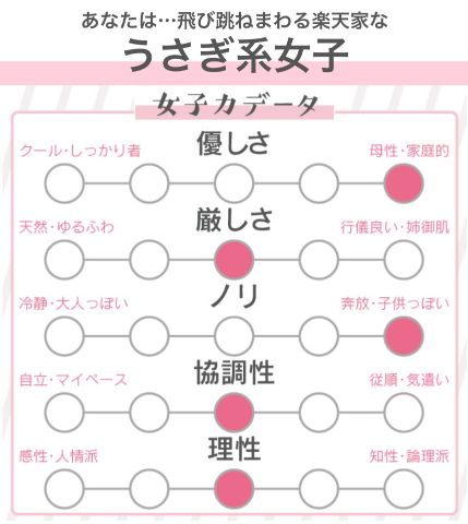 私は、飛び跳ねまわる楽天家な~うさぎ系女子~ノリが良く誰からも好かれる<女子力データ>優しさ:★★★★★厳しさ:★★★☆☆ノリ :★★★★★協調性:★★★☆☆理性 :★★★☆☆?