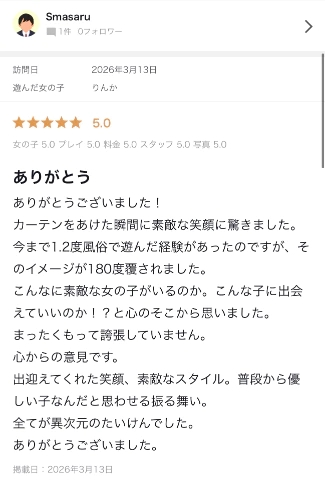 口コミありがとう😭✨高評価嬉しすぎる🤦♀️︎💕︎︎💕︎こういう店経験少ない中、出会ってくれありがとう🥹🙏🏻💖りんかでこういう店のイメージ180度覆さて嬉しい😆🌟たっくさん褒めてくれて嬉しい♡出会った時直接お兄さんのお口から聞きたかったなぁ(ー́ᵕー̀⌯🦻🏻)異次元な体験楽しかった?また遊びたいね(o・・o)/~ありがとうございました😭💖りんか🐈⬛